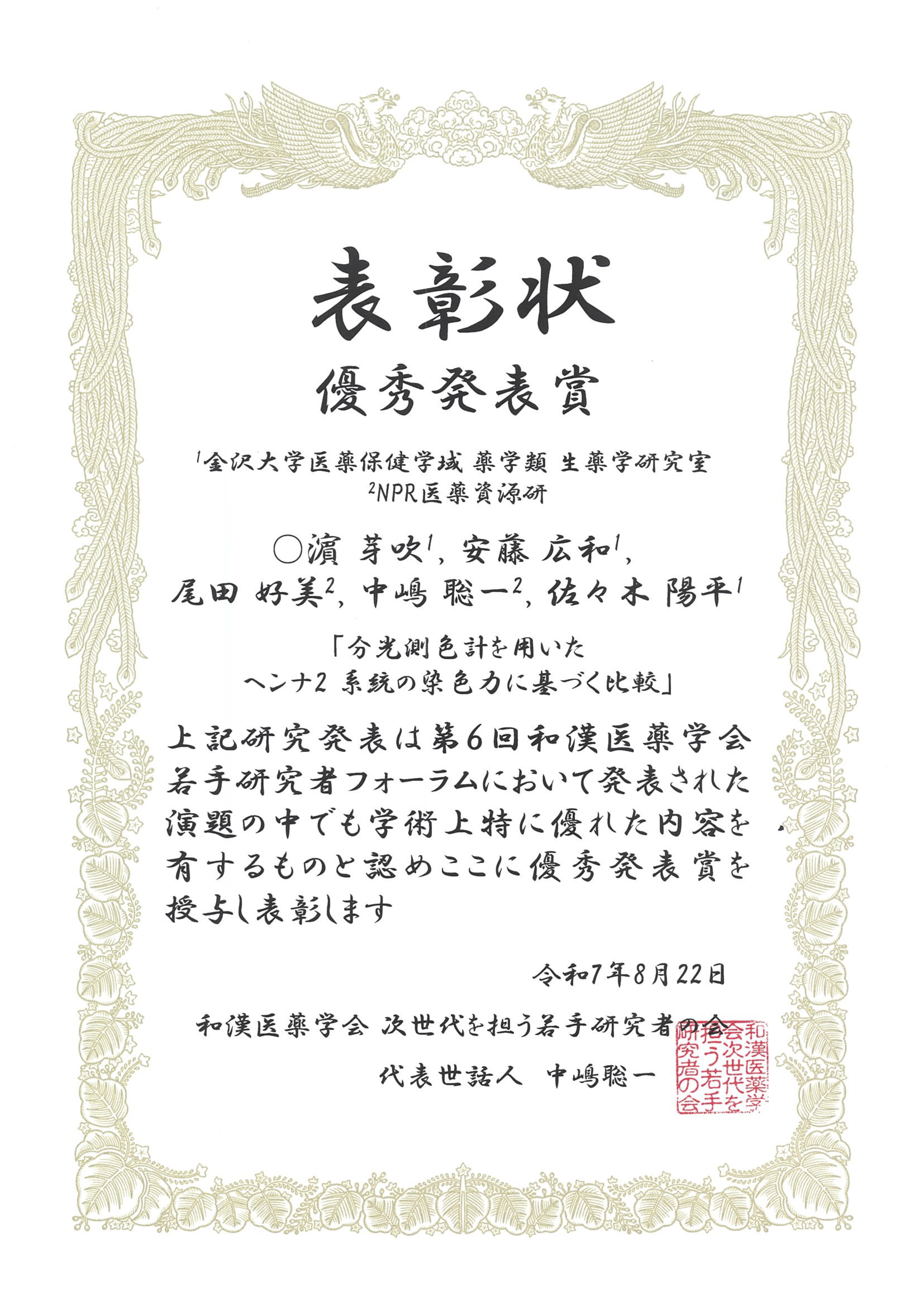 5.黄雨婷,安藤広和,辻野舞,吉原司貴,佐々木陽平,ジオウに含まれるcatalpolの安定性に関する研究,日本生薬学会第67回年会
