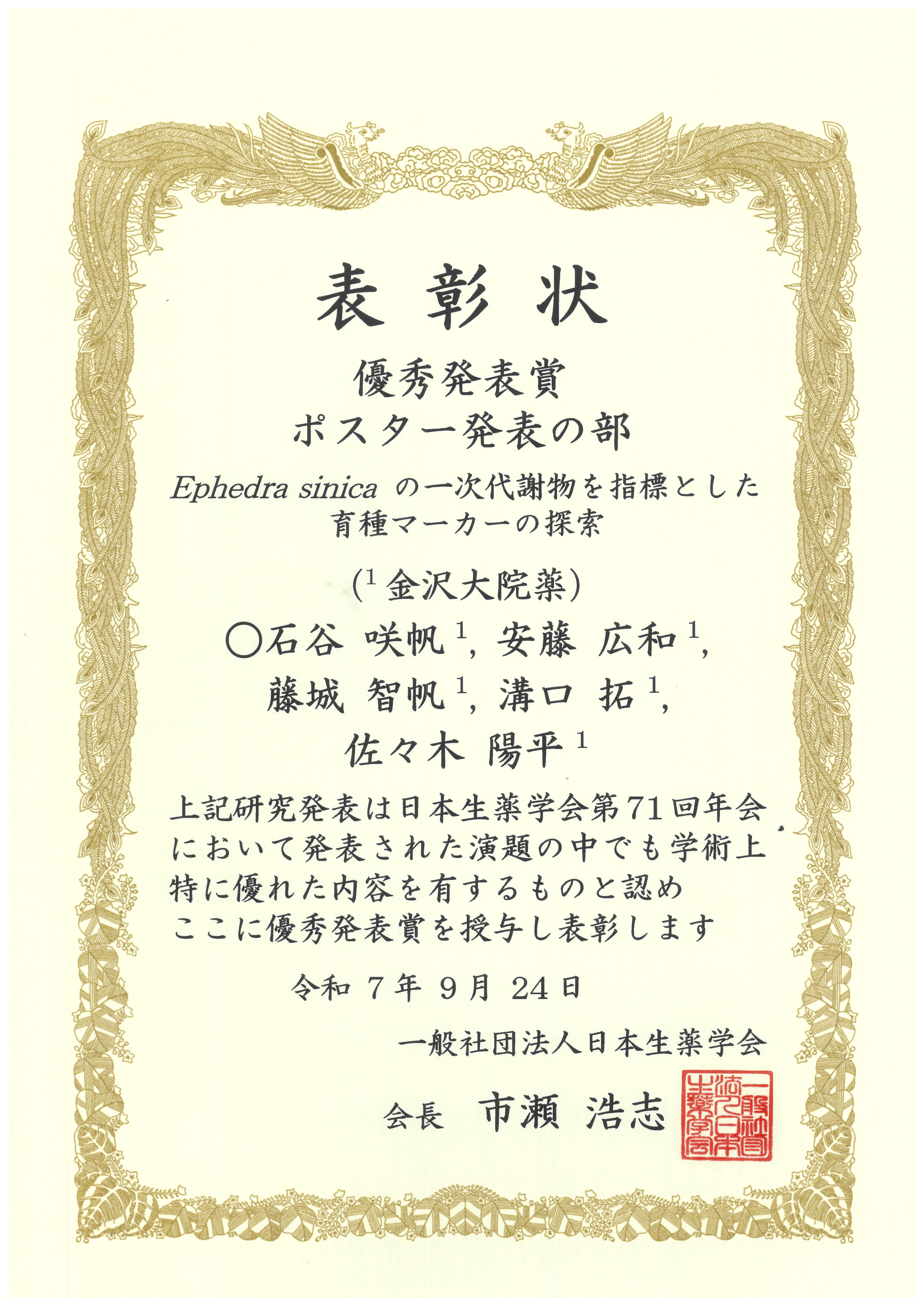 - 1.安藤広和,梅本知輝,工藤喜福,北村雅史,金田あい,倪斯然,野村行宏,佐々木陽平,御影雅幸,国産麻黄のアルカロイド組成に関する解析,薬用植物研究会第3回研究総会